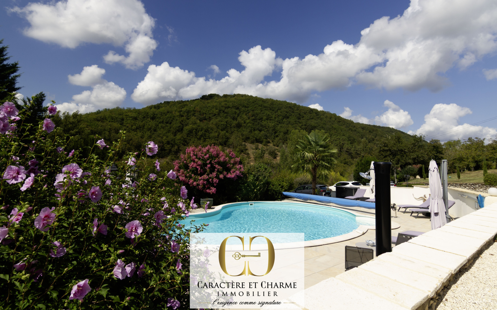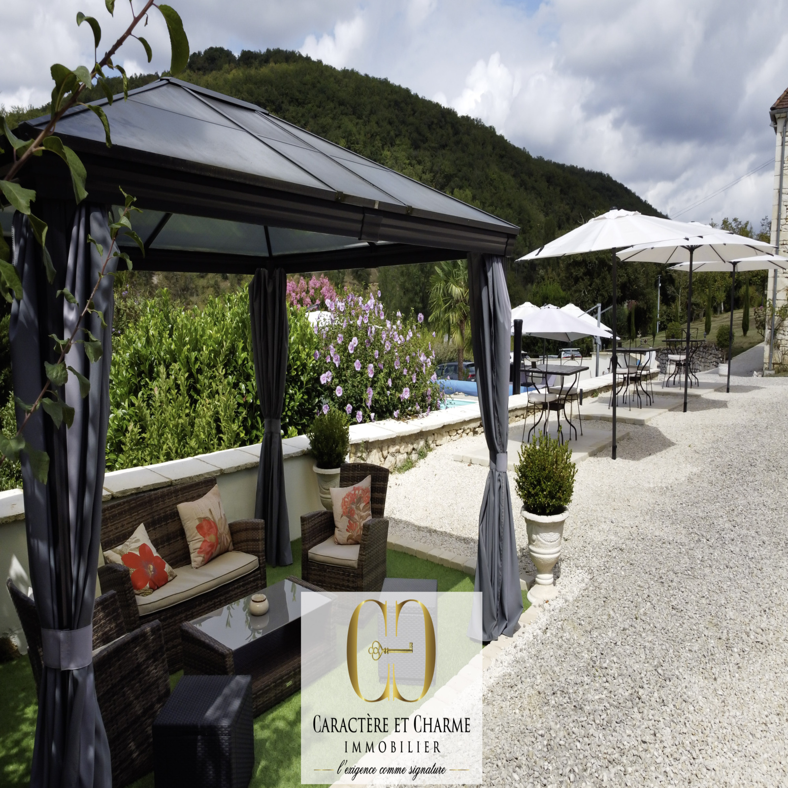 Proche de Sarlat. Belle propriété du Périgord, idéalement située dans la vallée de la Dordogne aux portes du Lot. Elle rayonne par sa localisation touristique centrale, sa convivialité, ses espaces et son potentiel, baignée de traditions et de prestations élevées. Elle se compose d'une maison principale de 210 m2 habitables (garage et cave en plus), d'un gîte indépendant (30 m2), et d'une grange récemment réhabilitée en chambres d'hôtes haut de gamme, offrant modernité et confort de vie (3 chambres d'hôtes + espace cuisine et salle). Les espaces extérieurs complètent à merveille ce lieu, avec ses terrasses, son espace piscine (chauffée) particulièrement agréable, le tout dans un écrin intimiste et reposant. Le positionnement à flanc de côteau de la maison, propose naturellement de très belles vues, notamment dans la maison principale. Lieu enchanteur, celui-ci permet partages et activités touristiques non-négligeables si vous souhaitez faire perdurer l'activité locative, aux abords des pistes cyclables (500 m) descentes en canoë (800 m) et donc la quasi totalité des sites touristiques de Dordogne et du lot à visiter à moins de 40 minutes. Un outil de travail très intéressant de par sa taille, ni trop grand ni trop petit avec donc son gîte et ses 3 chambres d'hôtes, pour un chiffre d'affaires conséquent et en constante augmentation, notamment grâce aux avis clients dithyrambiques sur la qualité du lieu. La partie chambres d'hôtes peut aisément se reconvertir en gîte, ou en maison d'amis pour une propriété entièrement familiale. Le terrain de 6200 m2 et les espaces naturels créés avec harmonie, entourent parfaitement les parties bâties, et s'entretiennent très facilement.