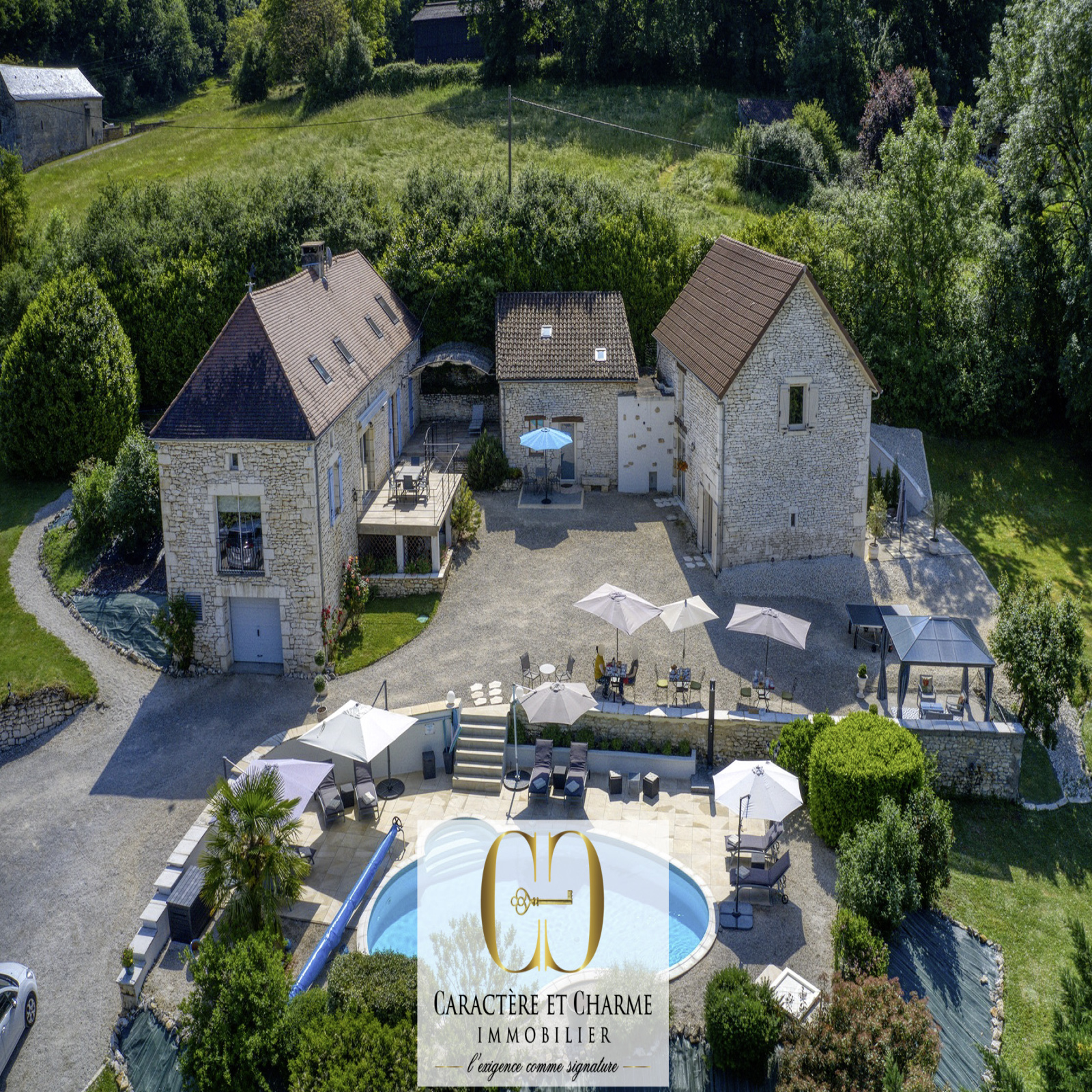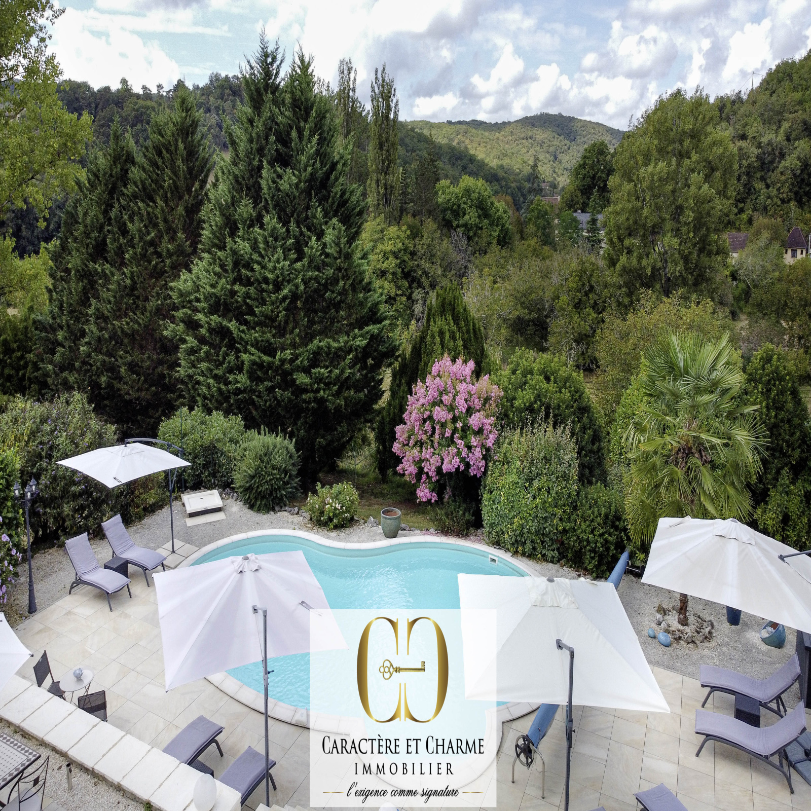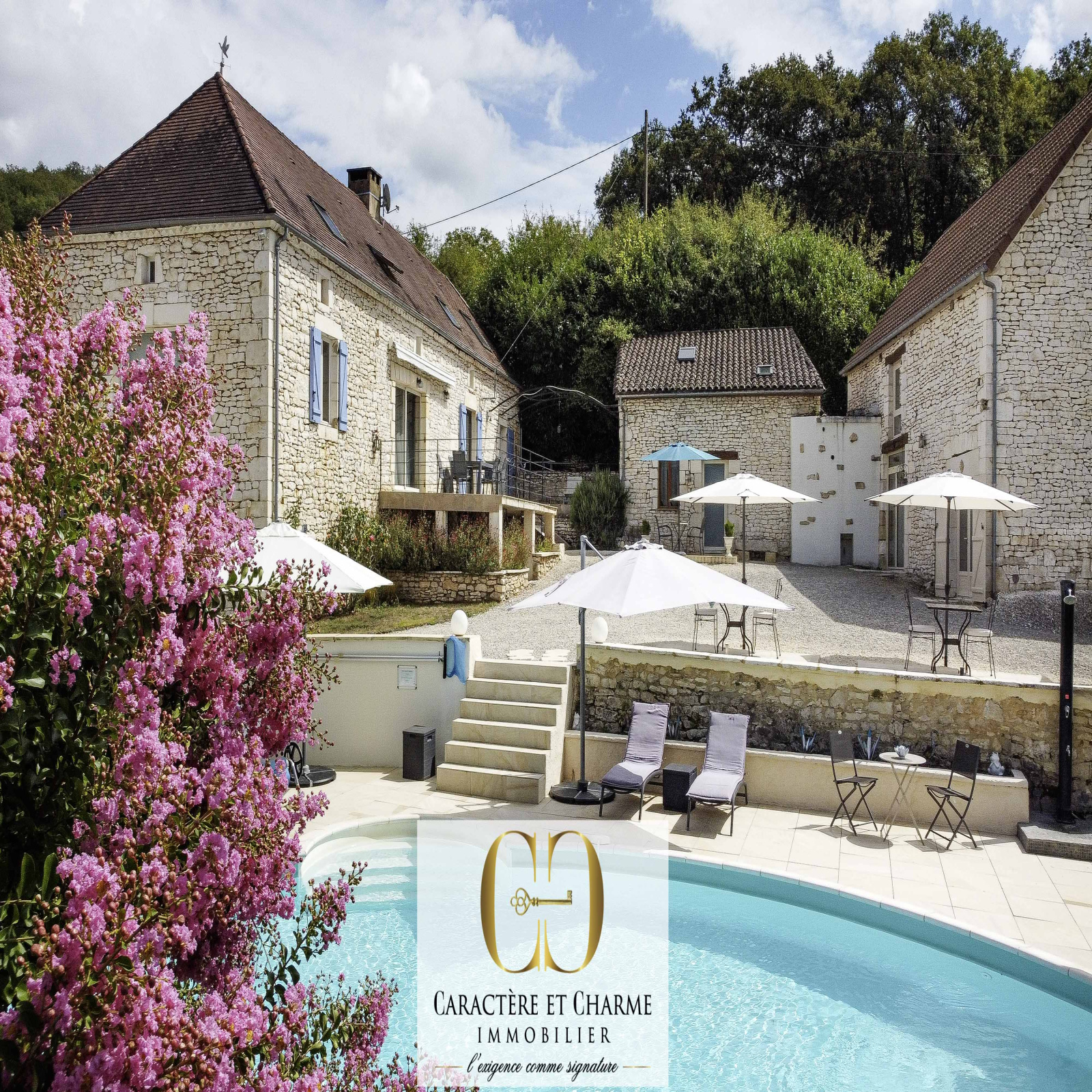 Proche de Sarlat. Belle propriété du Périgord, idéalement située dans la vallée de la Dordogne aux portes du Lot. Elle rayonne par sa localisation touristique centrale, sa convivialité, ses espaces et son potentiel, baignée de traditions et de prestations élevées. Elle se compose d'une maison principale de 210 m2 habitables (garage et cave en plus), d'un gîte indépendant (30 m2), et d'une grange récemment réhabilitée en chambres d'hôtes haut de gamme, offrant modernité et confort de vie (3 chambres d'hôtes + espace cuisine et salle). Les espaces extérieurs complètent à merveille ce lieu, avec ses terrasses, son espace piscine (chauffée) particulièrement agréable, le tout dans un écrin intimiste et reposant. Le positionnement à flanc de côteau de la maison, propose naturellement de très belles vues, notamment dans la maison principale. Lieu enchanteur, celui-ci permet partages et activités touristiques non-négligeables si vous souhaitez faire perdurer l'activité locative, aux abords des pistes cyclables (500 m) descentes en canoë (800 m) et donc la quasi totalité des sites touristiques de Dordogne et du lot à visiter à moins de 40 minutes. Un outil de travail très intéressant de par sa taille, ni trop grand ni trop petit avec donc son gîte et ses 3 chambres d'hôtes, pour un chiffre d'affaires conséquent et en constante augmentation, notamment grâce aux avis clients dithyrambiques sur la qualité du lieu. La partie chambres d'hôtes peut aisément se reconvertir en gîte, ou en maison d'amis pour une propriété entièrement familiale. Le terrain de 6200 m2 et les espaces naturels créés avec harmonie, entourent parfaitement les parties bâties, et s'entretiennent très facilement.