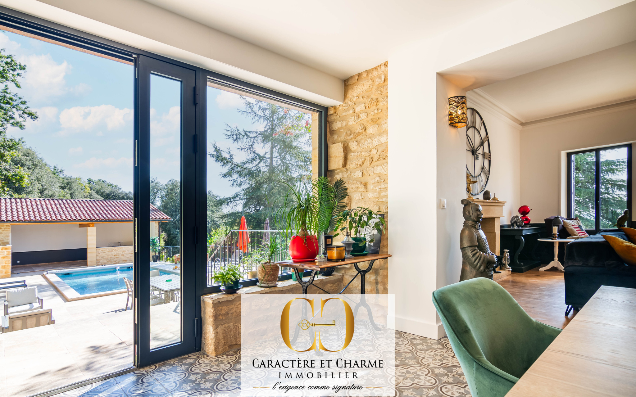Proximité immédiate de Sarlat, superbe propriété offrant un potentiel rare et remarquable. Une maison principale avec vue hauteur de 385 m2, restaurée avec des matériaux nobles, authentiques et de très haute qualité (huisseries aluminium, parquets bois traditionnel, pierres, charpentes apparentes...), dont une pièce salon/ cuisine de 65 m2 avec cheminée, accès terrasse, piscine chauffée et cuisine d'été. De grands espaces complètent cette habitation très lumineuse et particulièrement agréable, avec notamment 5 chambres ( dont 4 ensuites avec salles d'eau), et de grandes pièces qui pourront servir selon vos choix et projets (bureau, salle de cinéma, salle de sport ou autre...). Sur la propriété, 2 gîtes neufs de 68 m2 chacun avec 2 et 3 chambres, raviront hôtes ou famille et amis de passage. Des annexes et une grange de 380 m2 au sol restent à exploiter comme bon vous semble, à réhabiliter ou à utiliser selon vos besoins et objectifs. La structure en pierre de la grange est superbe et offre un cachet et une stature vraiment intéressante. Un permis de réhabilitation pour 2 gîtes supplémentaires avec 2 piscines existe et est vendu avec le bien. Le parc de 1,7 hectare en partie engazonné et boisé entoure le bien en créant un écrin naturel très agréable. Lieu paisible à quelques kilomètres seulement de Sarlat, il offre indéniablement qualité de vie, de réception, et d'extension. Bien rare sur le marché, notamment dans cet état et cette qualité de restauration, et au regard du potentiel restant. VISITE VIRTUELLE SUR DEMANDE.