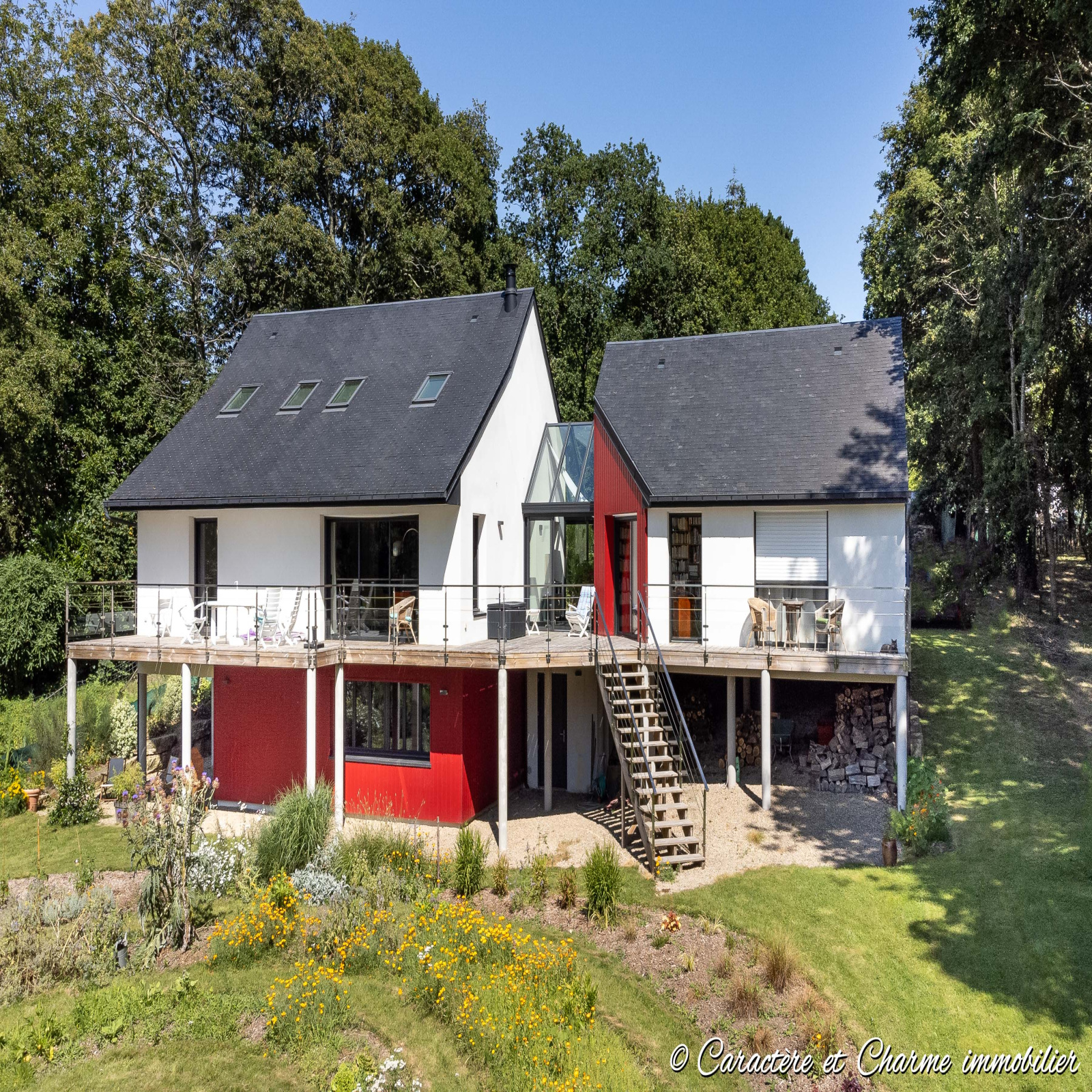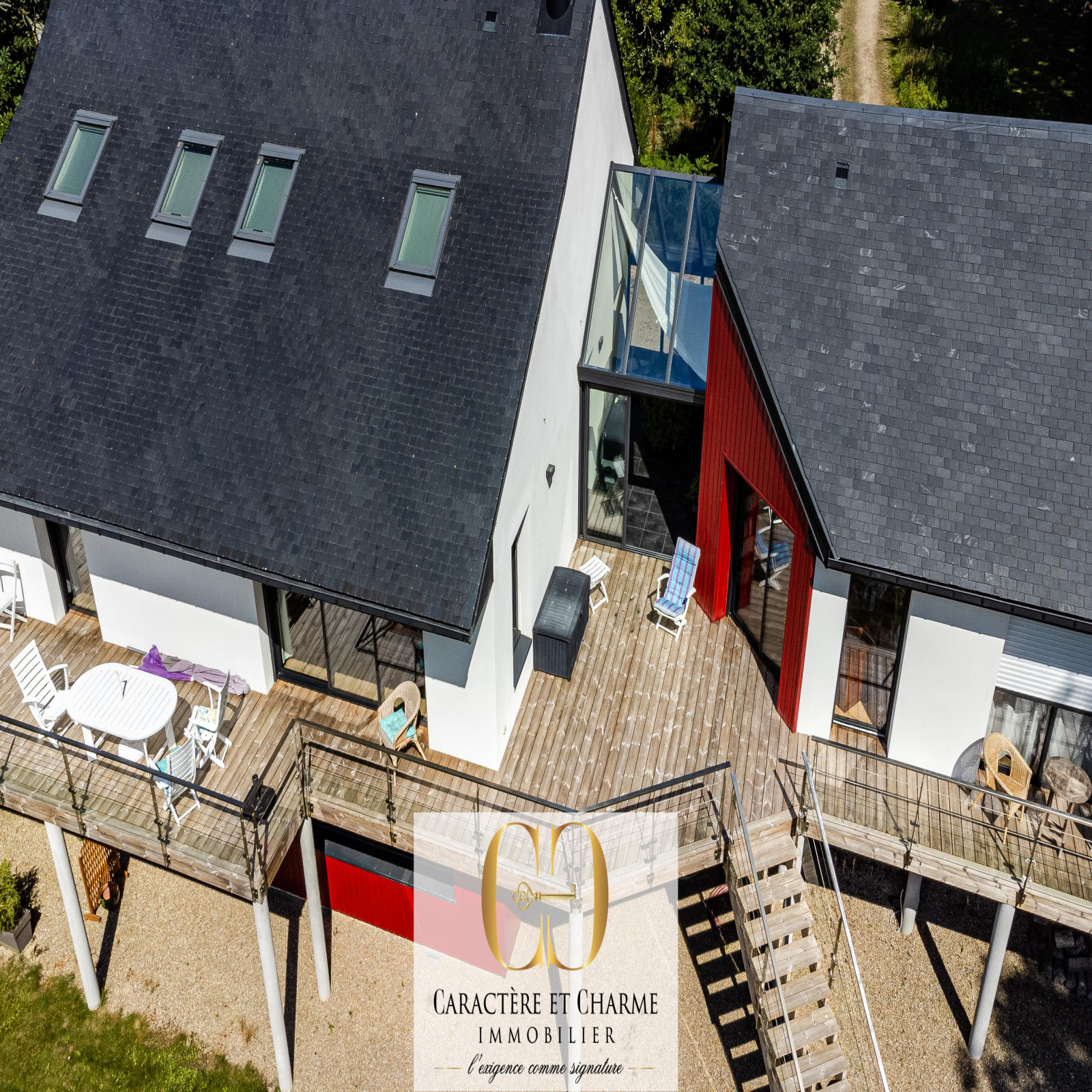 VIDEO ET VISITE VIRTUELLE 360° / 3D DISPONIBLES. 10 mn de Carnac et de La Trinité sur Mer. ( normes RT 2012 ). Voila une maison d'architecte moderne et atypique particulièrement agréable et ou règnent indéniablement qualité de vie et sérénité. Une architecture très plaisante et très lumineuse faisant de ce lieu un endroit résolument à part. Des matériaux nobles, des prestations complètes et des finitions très soignées avec un séjour de 56 m2 à couper le souffle, prolongé par sa terrasse en teck et sa vue nature. Cuisine ouverte splendide avec ilot central, chambre parentale avec salle de bain balnéo et dressing, coin bureau, toutes les pièces à vivre avec accès direct sur la terrasse en coursive sur pilotis, effet promontoire garanti, et ou vous pourrez à loisir vous détendre, déjeuner, ou vous poser à l'écart tellement celle ci est grande et invite à venir en profiter de diverses manières. A l'étage 2 chambres et une belle salle d'eau. Et au rez de jardin ( en demi sous sol ) un studio de 51 m2 idéal pour location, pour recevoir des amis ou bien pour créer un espace de travail. Le jardin et son cours d'eau, sur une parcelle de 2750 m2 complètent à merveille cette propriété, lui conférant sa douceur et son calme, en l'enveloppant d'une nature bienveillante. Vous l'aurez compris, c'est un lieu particulier, qui charme, qui attire par son caractère unique et sa qualité indéniable, c'est un lieu qui appelle...... Heureux et chanceux, celui qui entendra son message...