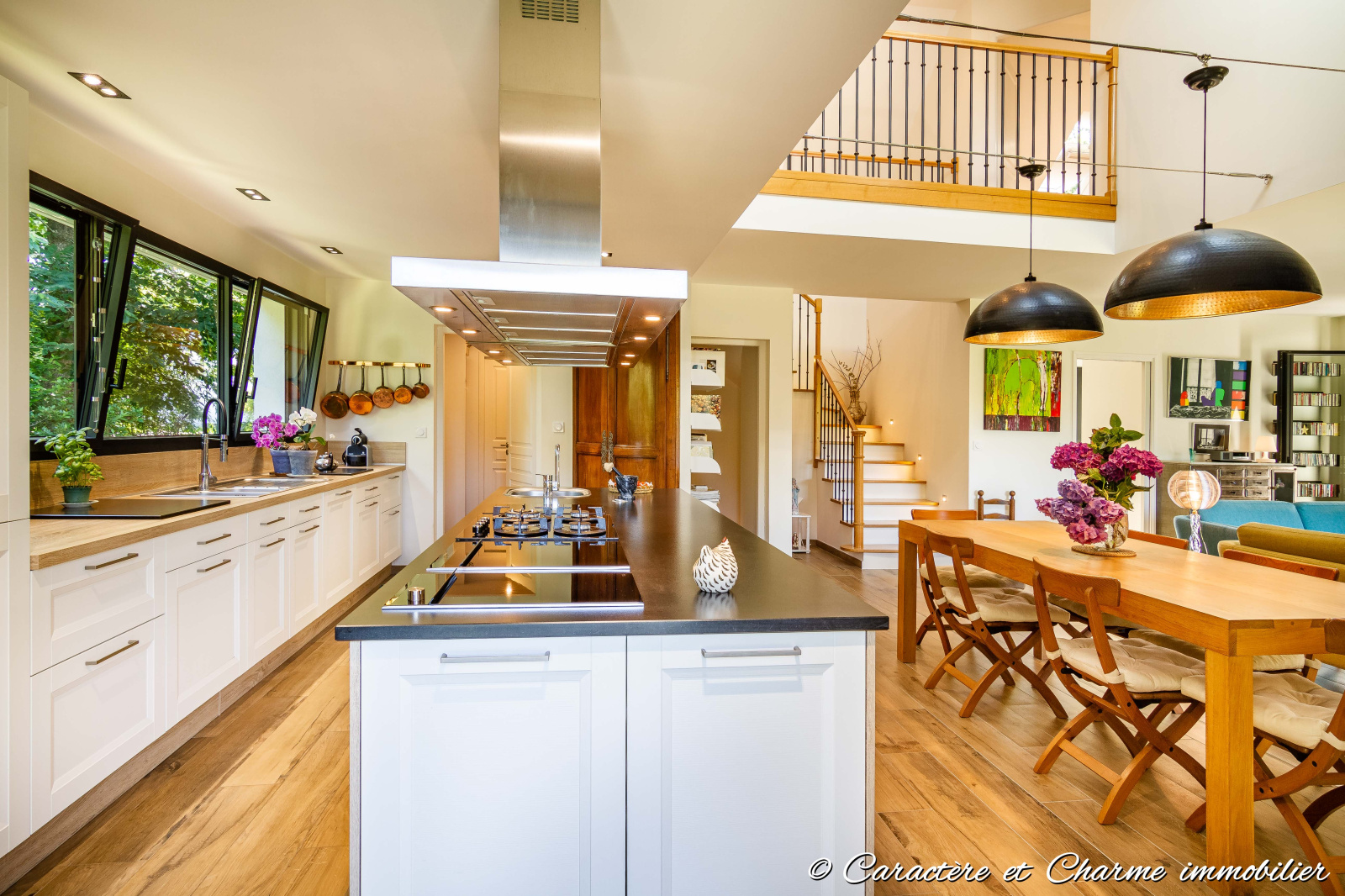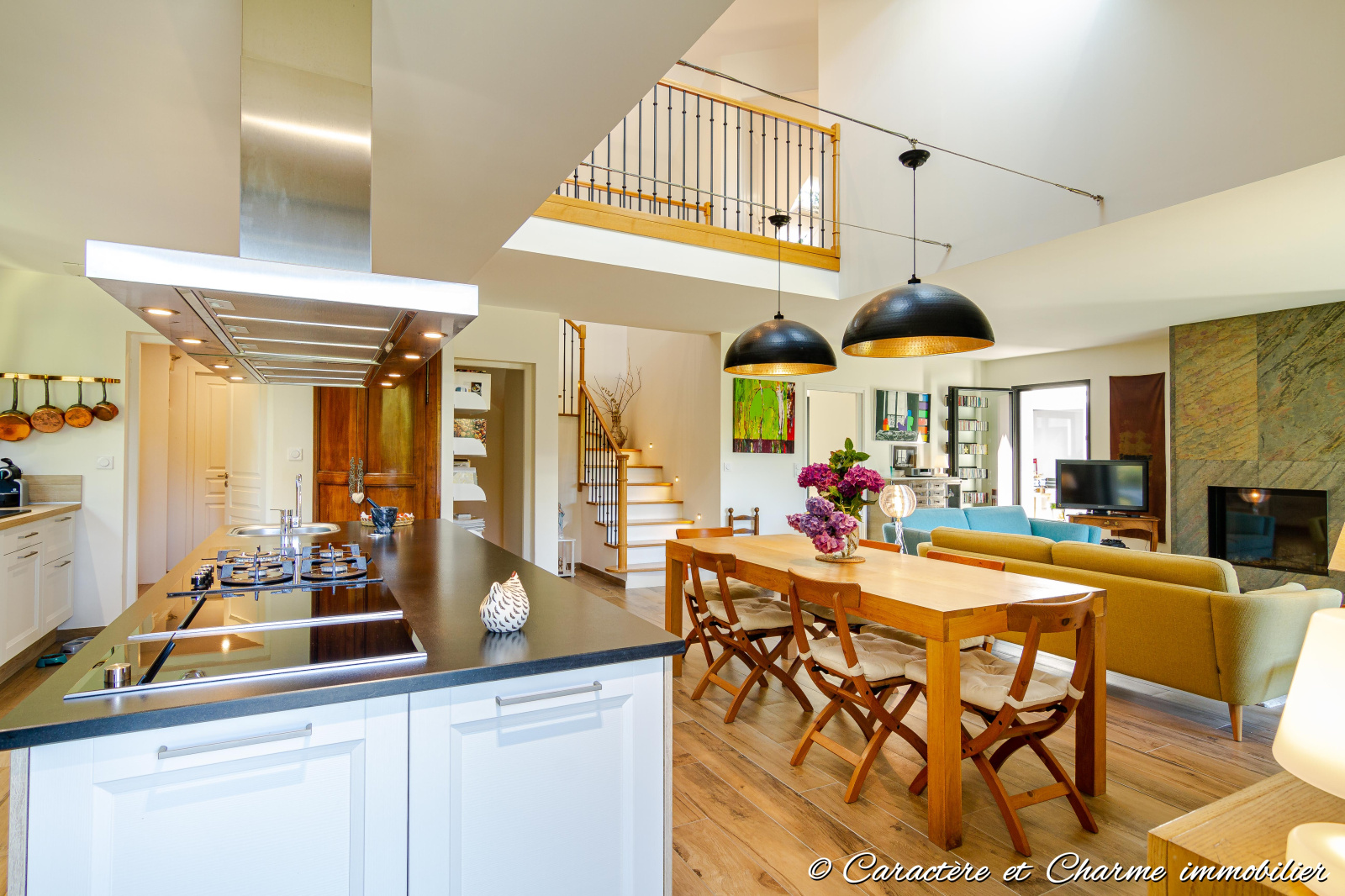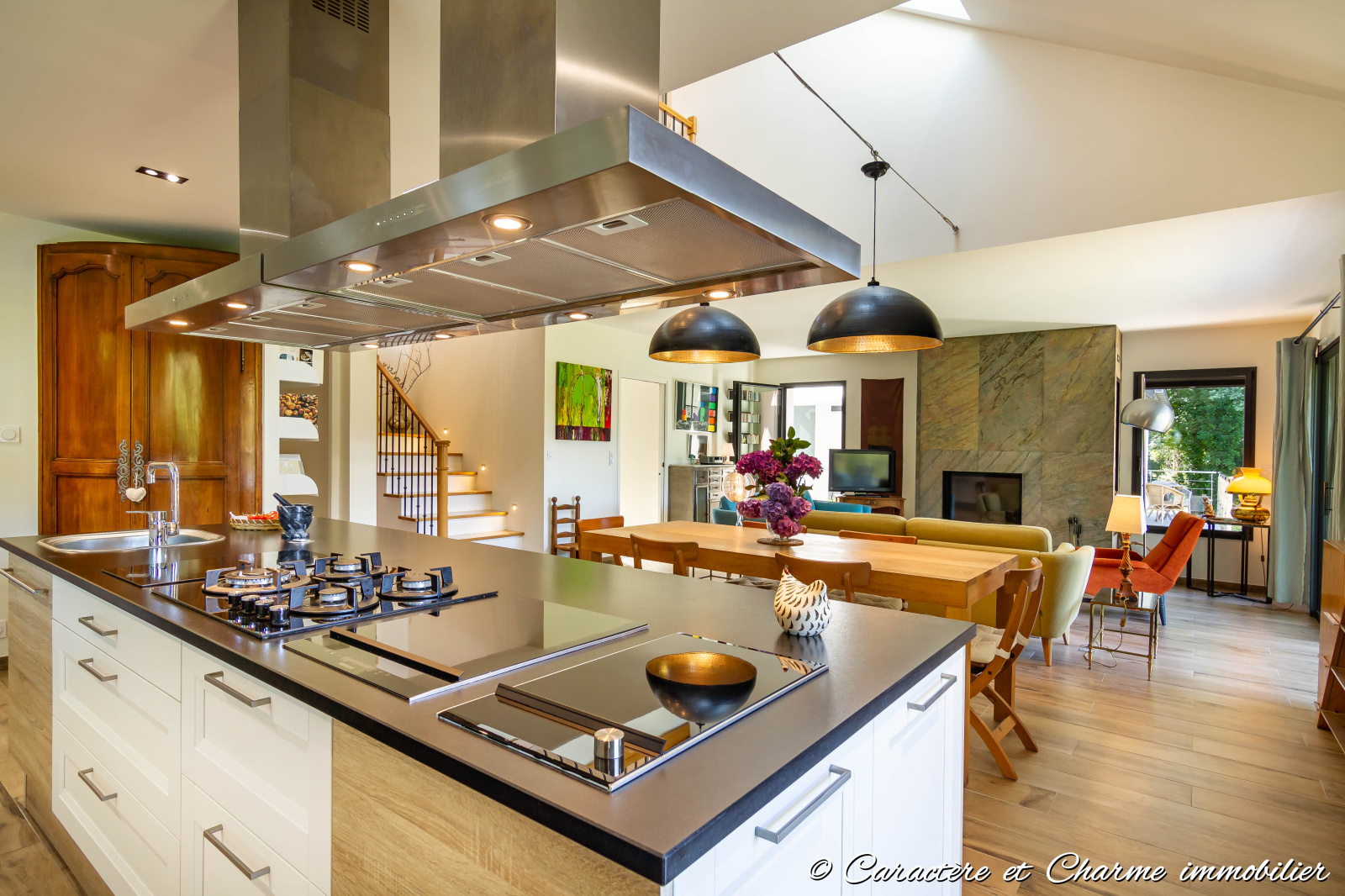 Cheminée avec insert avec rangement bois latéral - carrelage imitation bois - Baies alu - rideau élect - prises au sol - Eclairage intérieur ilot cuisine - Plancha japonaise et friteuse intégrée - plaque gaz -